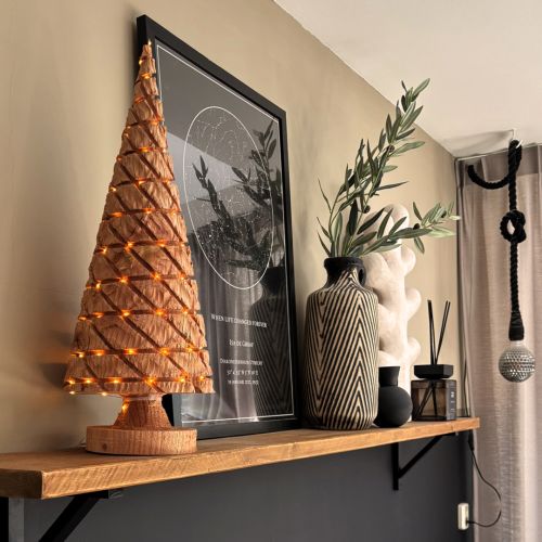 Zoek je dit jaar echt iets bijzonders voor in huis? Dit mooie kerstboompje in de kleur naturel met USB LED verlichting biedt de warme uitstraling die hoort bij de decembermaand. Harm zaagt dit boompje op ambachtelijke wijze uit een massief stuk hout. Echt handwerk, dus ieder boompje is uniek. Het boompje is subtiel maar toch mooi aanwezig. Door zijn vormgeving is het ideaal te plaatsen in bijvoorbeeld een vensterbank of op een bijzettafel. Of je de lampjes nou wel of niet laat branden, dit boompje is een mooie toevoeging aan uw inrichting in huis.